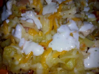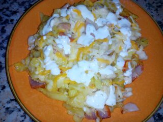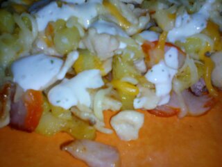 Mezclamos las patatas, la magreta y parte de la salsa. Echamos en una bandeja para horno, espolvoreamos con el queso rallado e introducimos en el horno para gratinarlas.