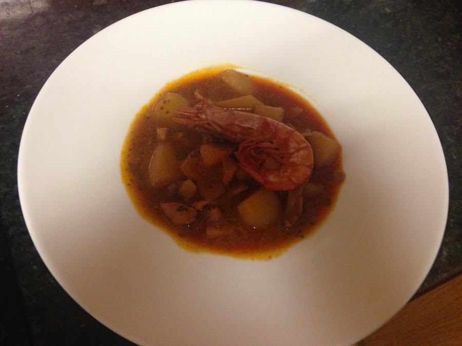 Añadiremos el calamar limpio y cortado, las gambas, las patatas y el caldo de pescado.