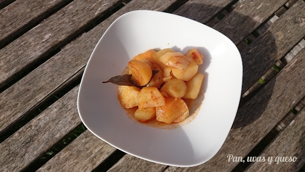 Pelamos las patatas, las lavamos, las secamos y las cortamos en trozos. Las echamos en otra cacerola y añadimos la cebolla troceada, el pimentón, los dientes de ajo sin pelar, el laurel, la pimienta y un chorro de aceite de oliva.