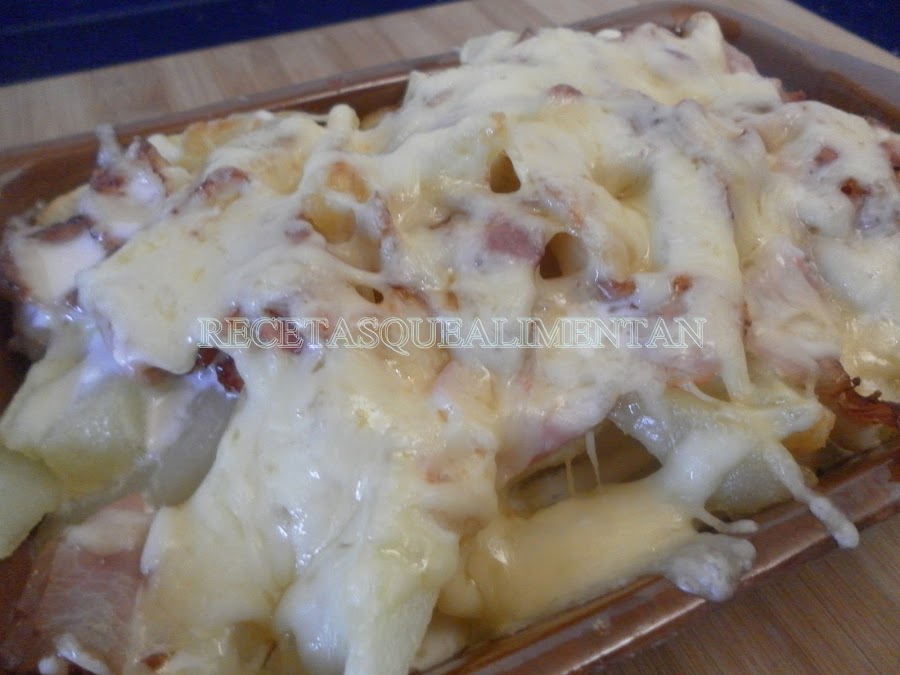 700 gr. patatas, 200 gr. bacon, 150 gr. queso, aceite de oliva, sal.