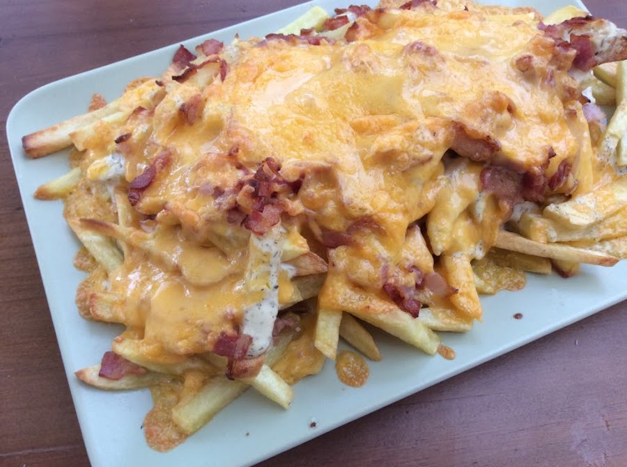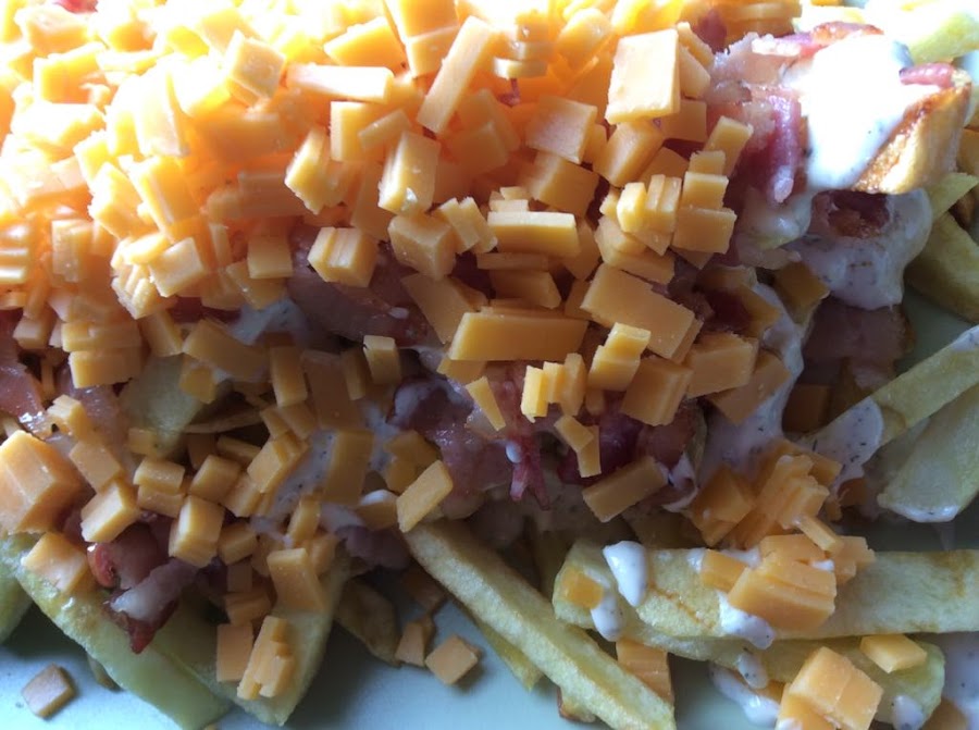 A continuación, poner las patatas fritas en una bandeja apta para el horno. Repartir el bacon por encima y regar con la salsa ranchera.