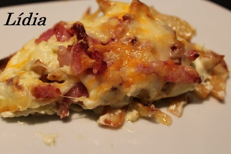 En una bandeja de horno pondremos las patatas, la salsa por encima, repartimos el queso rallado y el bacon y gratinaremos