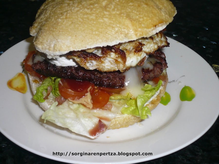 Y si mahoma no va al Foster´s, el Foster´s viene a casa, acompañamos las ricas patatas con una hamburguesa con lechuga, tomate, queso de cabra, virutas de bacon y huevo, eso si, con un rico pan de hamburguesas artesano. Rico rico!