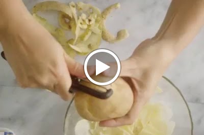 *I think the best potatoes for this recipe are those good for frying. They should be oval form and not be larger than the width of the peeler blade. In this way, it is easier to slice.
