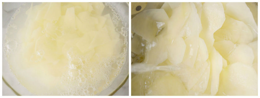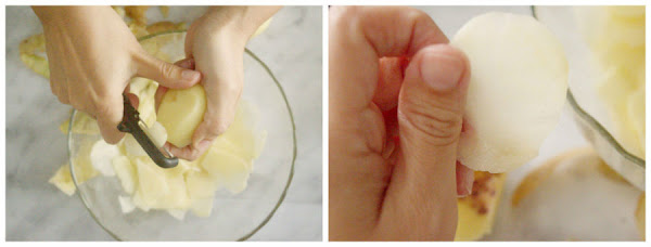 Slice potatoes with the same peeler, plac ein a bowl and cover with some water.