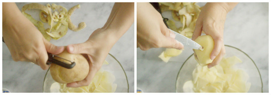 Pelamos las patatas con el pelador, las lavamos y le quitamos los ojos.