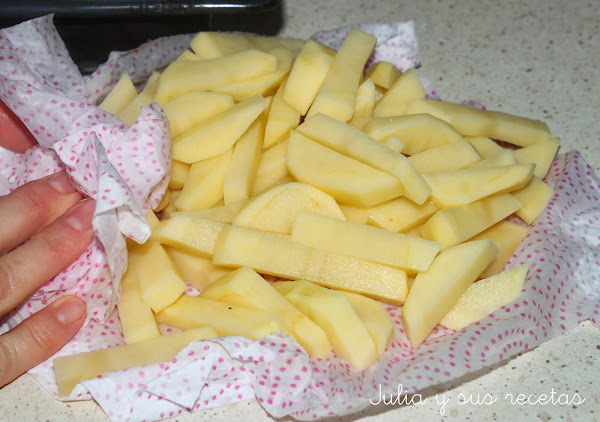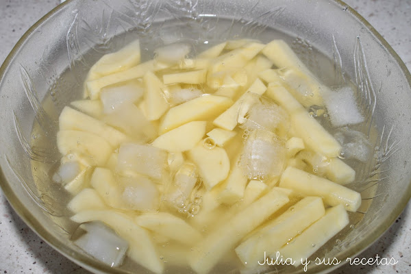 Pelamos y picamos las patatas en bastones de 2 cm de grosor mas o menos. Las ponemos en un cuenco con agua y cubitos de hielo durante 10-15 minutos.