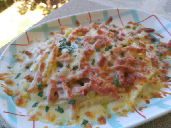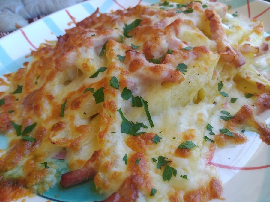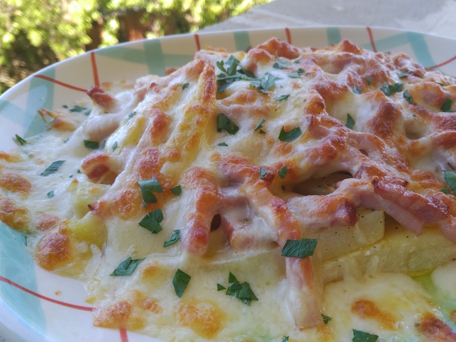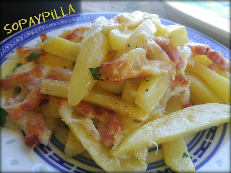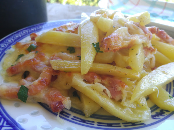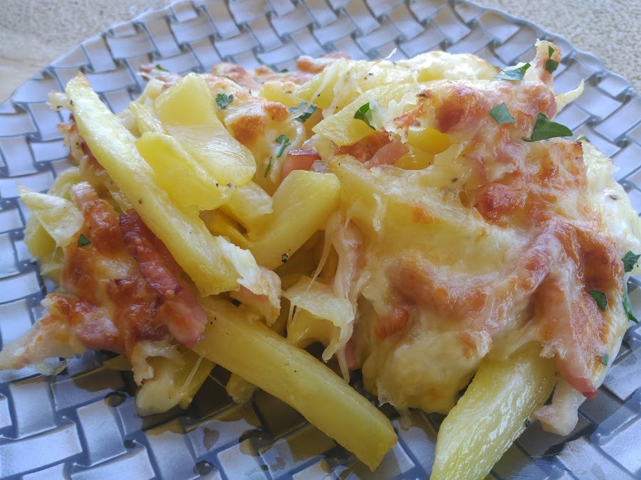 - Colocar las papas en una fuente apta para horno, y el bacon previamente escurrido del aceite.