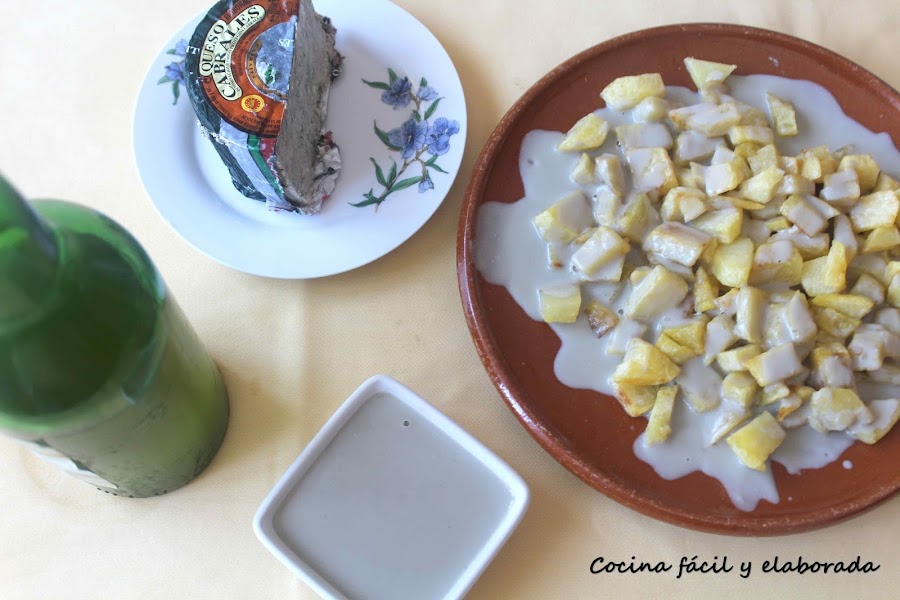 Pelamos las patatas y las cortamos en dados o en trozos como para hacer una tortilla, salamos al gusto y las freímos en abundante aceite caliente. Escurrimos bien en una fuente con papel de cocina absorbente para quitar el exceso de aceite. Pasamos las patatas a una fuente o platos individuales amplios y vertemos la salsa encima. Reserva una parte de la misma y la ponéis en una salsera para acompañar.
