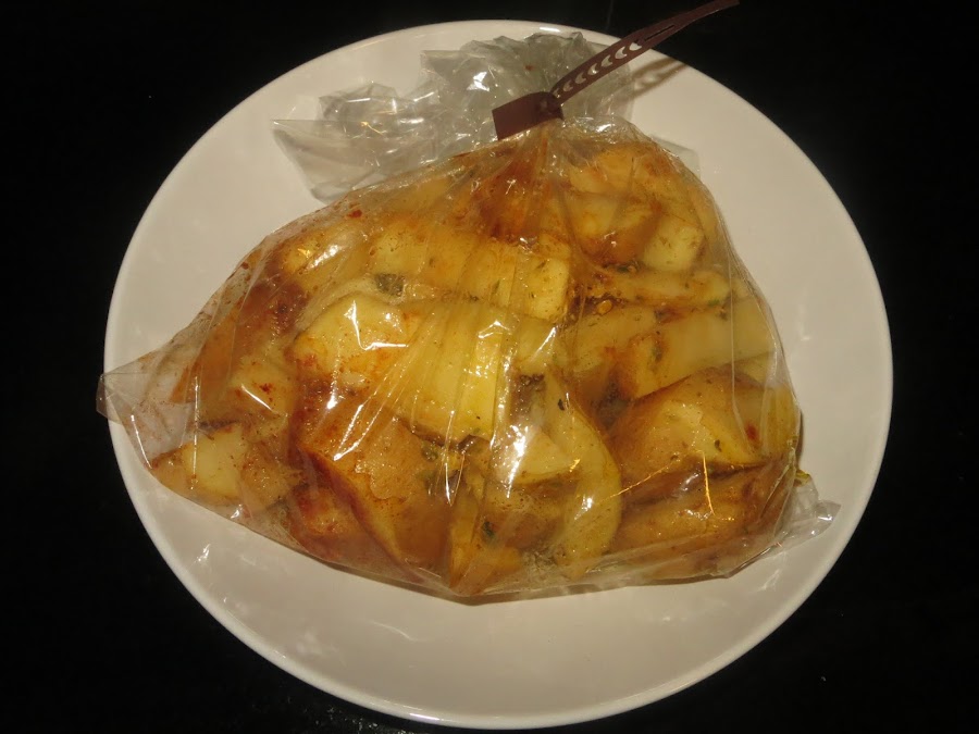 Lavamos bien las patatas y las partimos en gajos, las metemos en una bolsa apta para microondas, añadimos todas las especias y un chorro generoso de aceite de oliva virgen extra. Cerramos la bolsa, la agitamos para que se impregnen todas las patatas, las ponemos en un recipiente apto para microondas y lo ponemos durante 10 minutos a 700 watios.