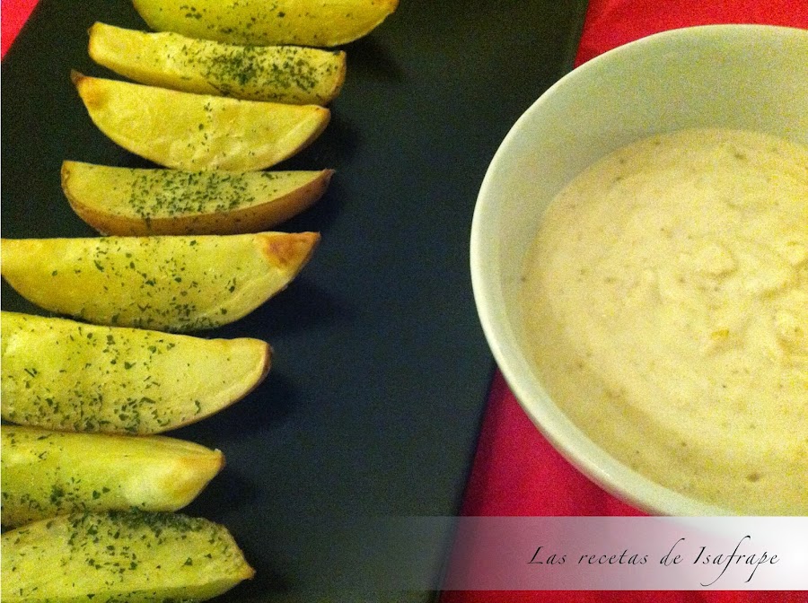 Batimos los ajos junto con la mayonesa, el yogur y sal al gusto. Una vez hechas las patatas las sacamos y esparcimos perejil (opcional). Servimos los gajos acompañados de la salsa de ajos.