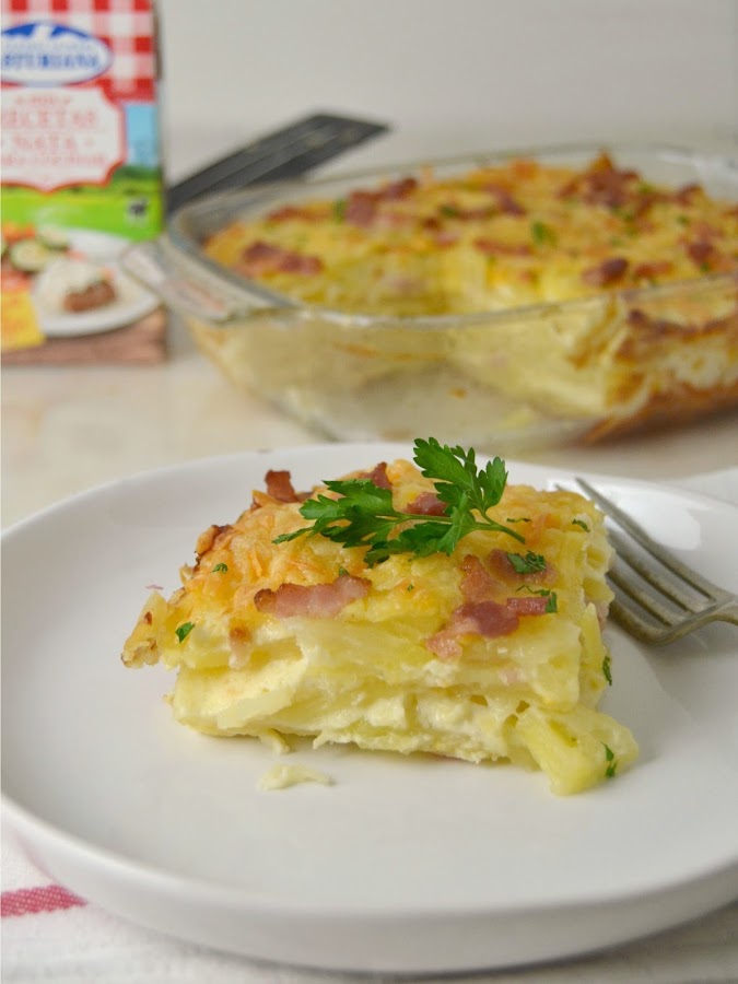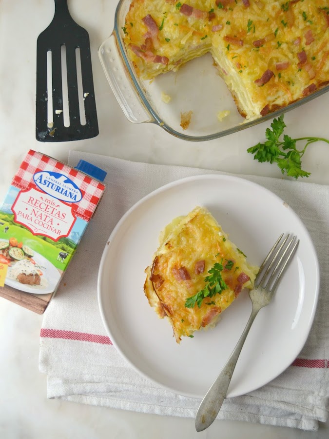 Lo bueno de esta receta es que la puedes preparar con ingredientes que, seguro, que tienes en la despensa: Patatas, queso, bacon, huevos y nata (crema de leche).