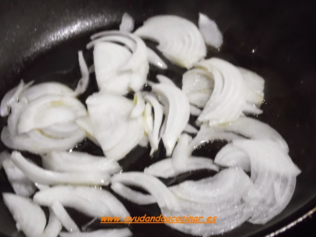 En una sartén rehogar la cebolla fileteada con la cucharada de aceite de oliva virgen.