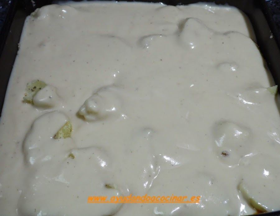Verter la bechamel sobre las patatas.