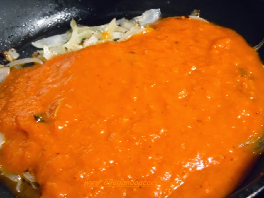 Una vez rehogada incorporar la salsa de tomate ( también podemos utilizar tomate frito), remover y dejar cocinar unos cinco minutos.