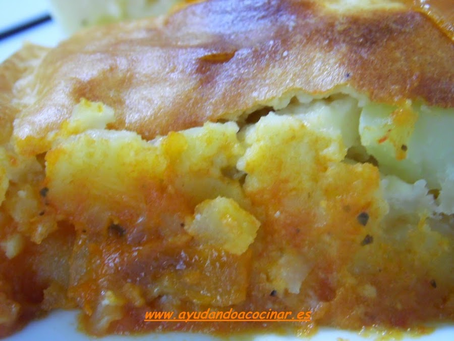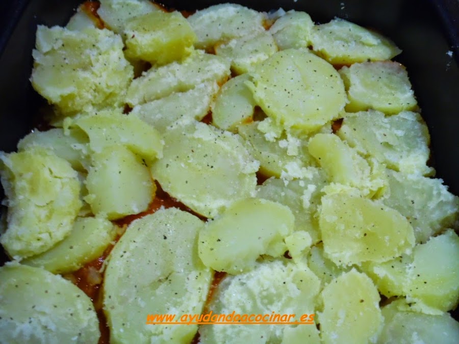 Una vez cocidadas las patatas quitar la piel, cortar en rodajas y colocarlas sobre la salsa de tomate.