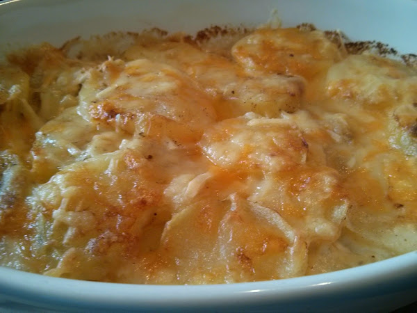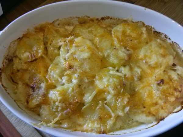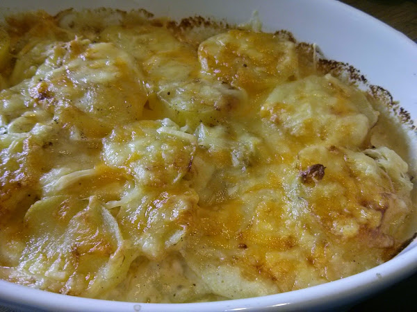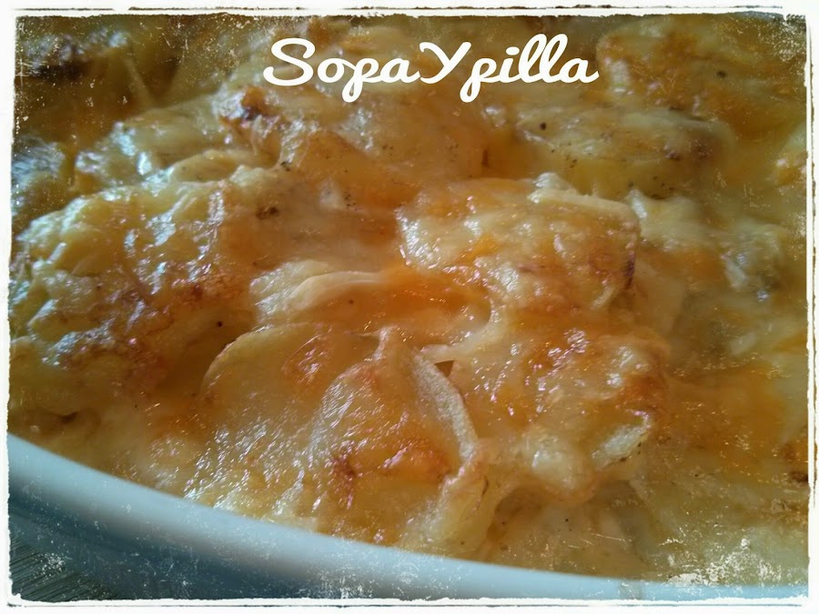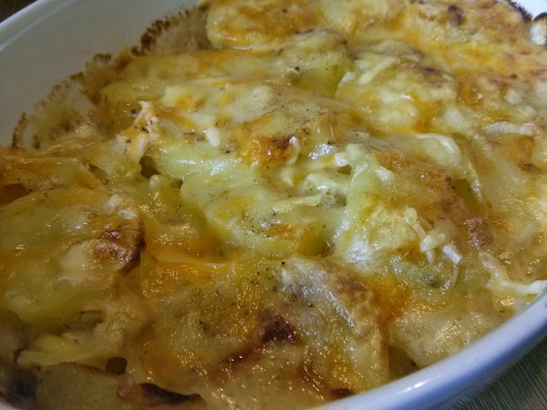 - En un recipiente apto para horno poner una capita de nata (crema de leche), la mitad del ajo, nuez moscada, sal, pimienta, una capa de patatas y una capa de queso.