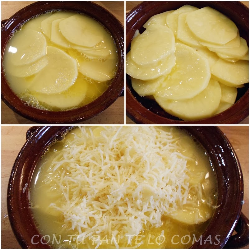 Pelamos las patatas y las cortamos en rodajas finitas. En cada cazuelita (que pueda ir directamente al horno) ponemos una patata y la sazonamos con sal. Derretimos la mantequilla y la echamos por encima de la patata.