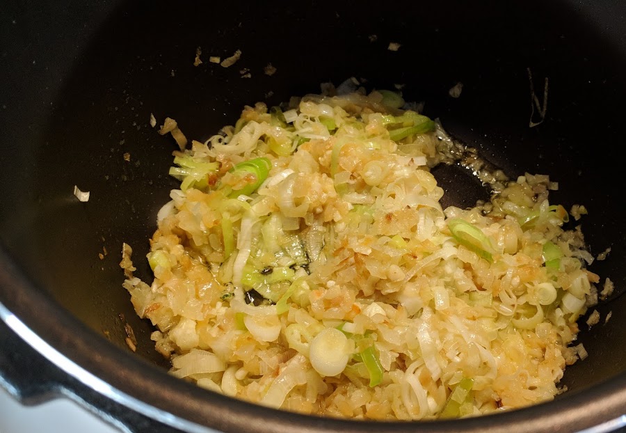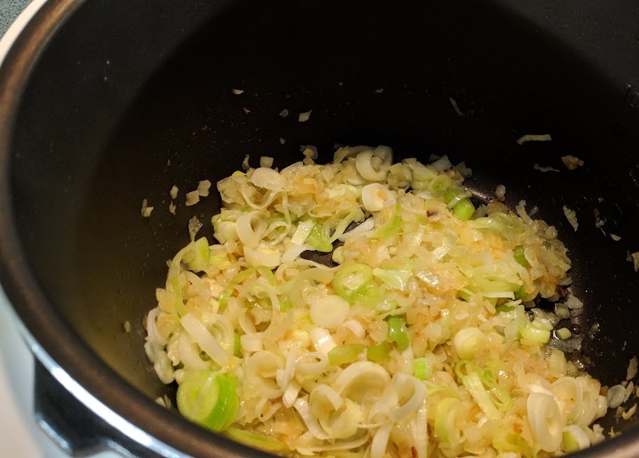 Sin limpiar la cubeta pon el aceite, las cebollas cortadas en trocitos y los puerros en rodajas finas