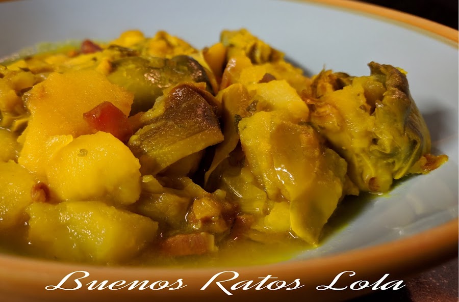 Cuando empiece a dorarse añade el ajo y mezcla bien. Mientras está sofriéndose la verdura ve preparando las alcachofas. Quita todas las hojas duras hasta dejar los corazones que partirás en cuartos. Pela los tallos y corta en trozos. Cada vez que prepares una alcachofa pasa el medio limón por encima, para que no se oxide. No abuses del limón porque quedaría muy ácido el guiso