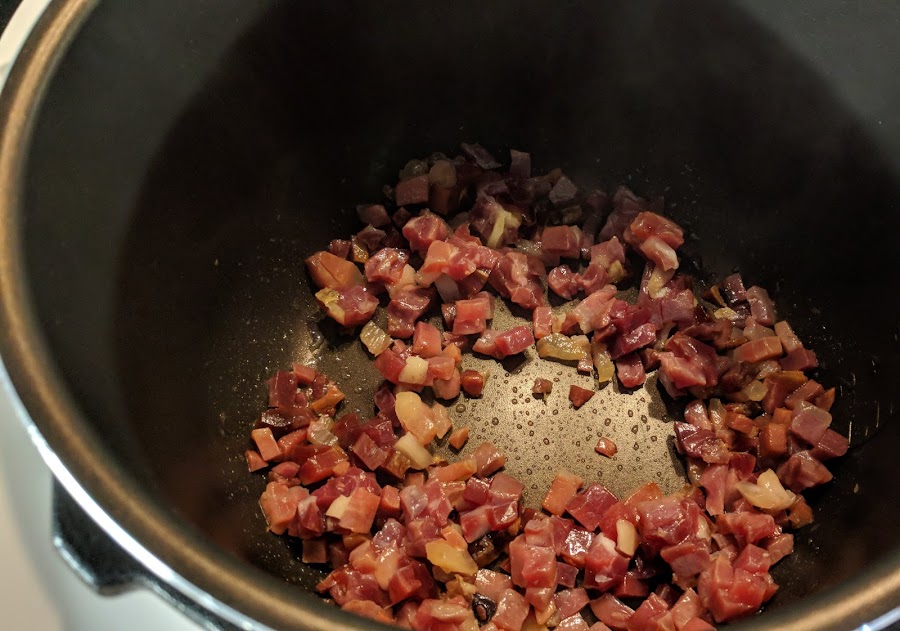 Medio limónPonemos en la cubeta dos gotas de aceite y seleccionamos menú freír. Echamos el jamón en taquitos y salteamos dos minutos (en cuanto cambian de color sacamos a un plato y reservamos)