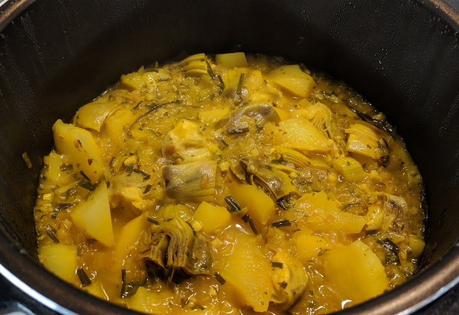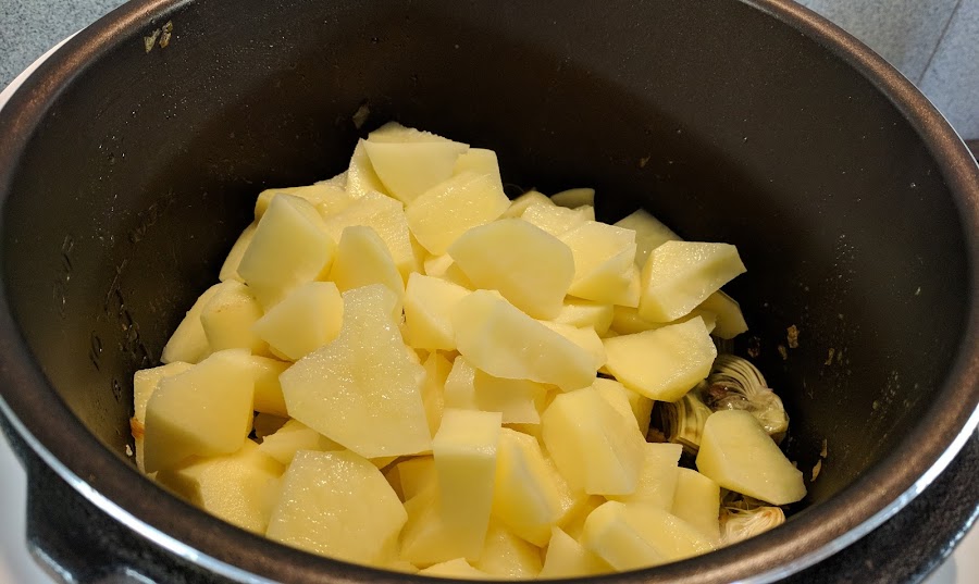 Para la cocción con las patatas programa menú guiso a 160 durante 5 minutos y deja que se despresurice sola