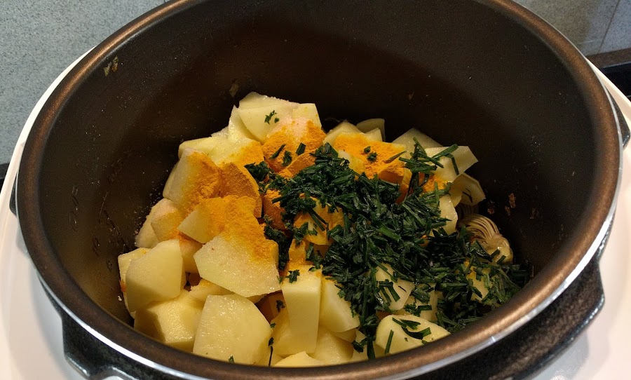 Pela, lava las patatas y cortarlas en trozos chascándolas para engordar el caldo sin añadir harina. Pon en la cubeta. Añade 800 ml de agua, la cúrcuma, el perejil, la salsa y el cebollino. Remueve y cierra la olla con válvula cerrada. Programa menú verduras predeterminado