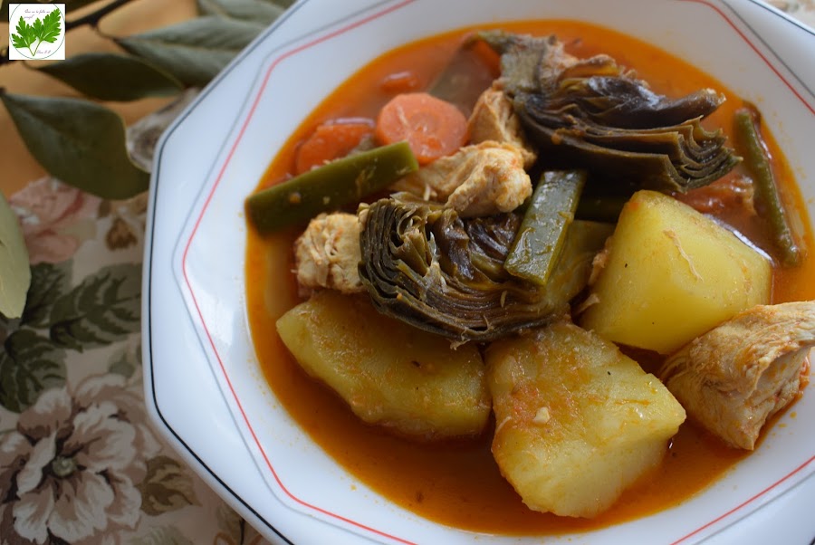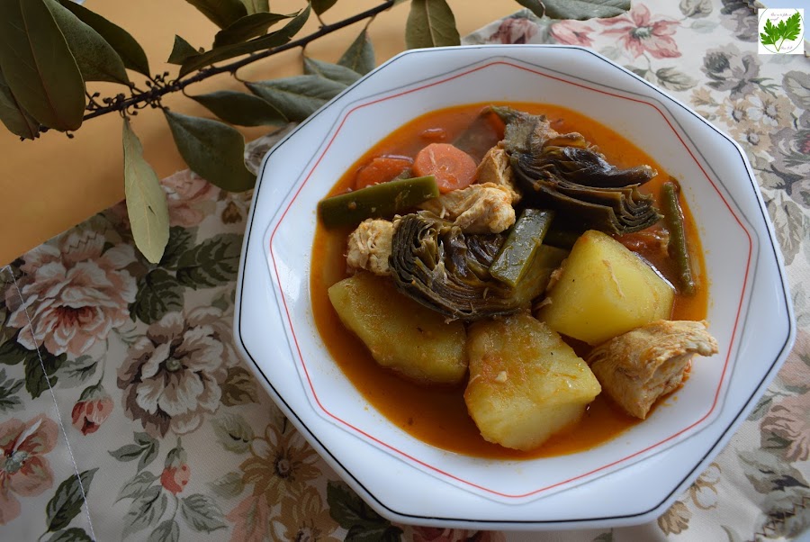 Pon a calentar el aceite en el fondo de una cazuela. Añade los dientes de ajos laminados, la cebolla y pimientos picados. Sofríe durante varios minutos. Añade el pollo troceado, continúa rehogando unos minutos más a fuego medio-bajo. Añade las zanahorias cortadas en rodajas y las alcachofas en cuertos desprovistas de las hojas externas mñas verdes, remueve con cuidado para que quede todo integrado. Incorpora las patatas chascadas, las judías verdes sin las hebras laterales y troceadas, así como el resto de ingredientes, cubre con el agua o caldo de verduras. Cuece a fuego medio y cuando comience a hervir baja el fuego, continúa cocinando unos 20 minutos hasta que las patatas y el resto de ingredientes estén tiernos.