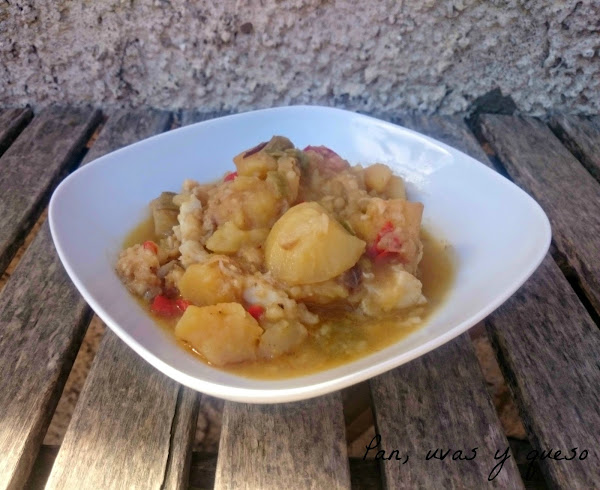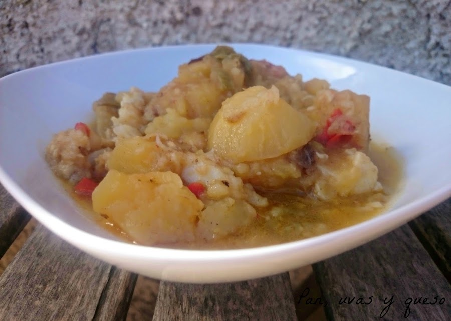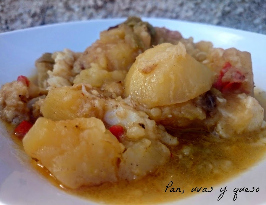 Este plato se parece muchísimo guisao de patatas con bacalao que preparé hace tiempo. La diferencia fundamental es que en el plato que traigo hoy no se utiliza alcohol para cocinarlo.