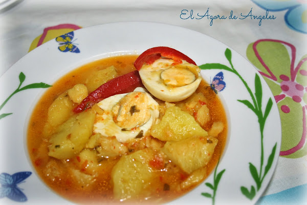 Ponemos a cocer y cuando falten 5 minutos para que las patatas estén hechas añadimos el bacalao y las tiras de pimiento rojo.