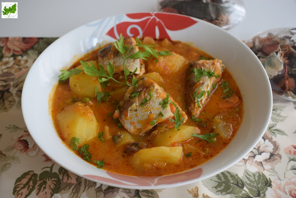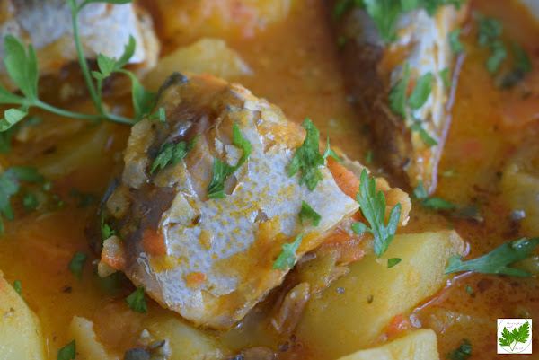 Pon a calentar aceite en el fondo de una cacerola, pica la cebolla y el pimiento. Sofríe y añade el tomate triturado. Sigue sofriendo unos minutos más, remueve y añade la zanahoria cortada en rodajas. Incorpora las patatas chascadas, guisantes, orégano, laurel, pimentón y sal. Da unas vueltas e incorpora el caldo o agua . Espera unos 20 minutos a que las patatas estén tiernas y añade las caballas troceadas. Cuece unos 5 minutos más a fuego medio-bajo.