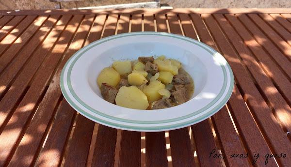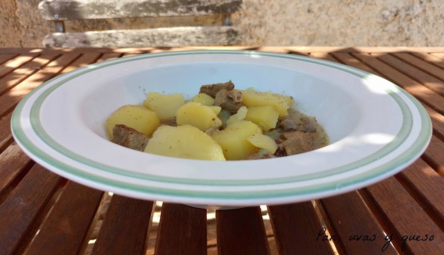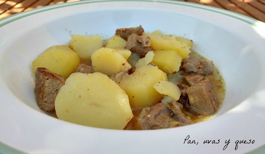 Calentamos aceite en una cacerola y sofreímos la cebolla hasta que esté dorada. Añadimos el perejil y la carne cortada en tacos. Doramosla carne y añadimos las patatas, cortadas en rodajas gruesas, y la pimienta. Rehogamos todo. Cubrimos con el agua caliente y dejamos cocer a fuego lento hasta que las patatas estén tiernas.