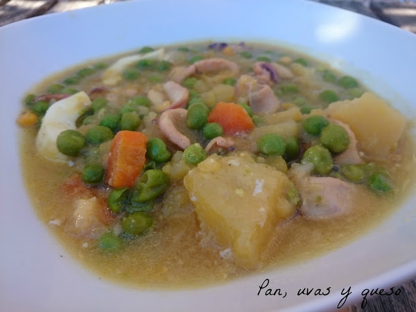 En una cacerola, calentamos un poco de aceite de oliva y sofreímosel ajo y la cebolla. Añadimos los chipirones y los rehogamosun par de minutos, lo justo para que cambien de color. Añadimos la zanahoria, los guisantes, las patatas y el azafrán.