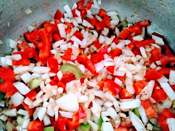 Picamos finamente los pimientos, la cebolla y los dientes de ajo.