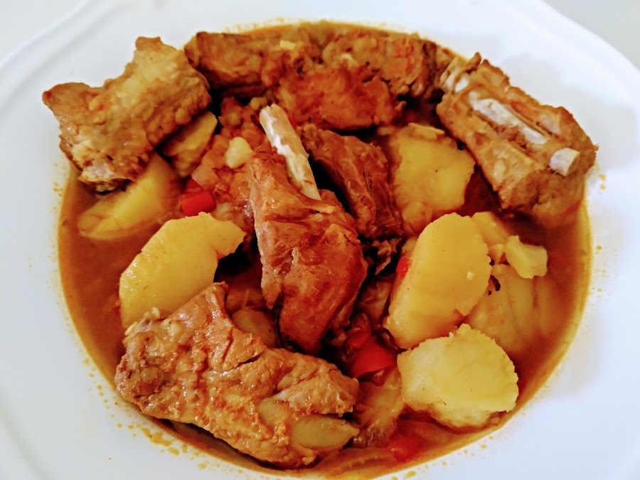 Incorporamos las costillas y removemos bien. Echamos parte del caldo y añadimos las patatas previamente cortadas. Cubrimos con el caldo de carne restante, echamos la cucharadita de pimentón y una pizca de sal y removemos.