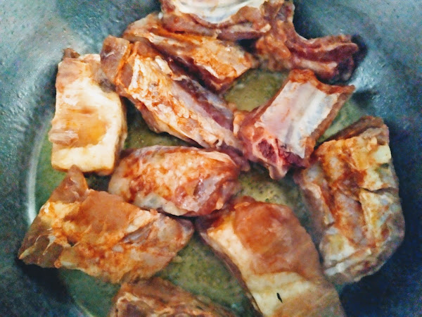 En una cazuela amplia o en una olla echamos unas 3 cucharadas de aceite de oliva virgen, cuando este caliente doramos las costillas adobadas.