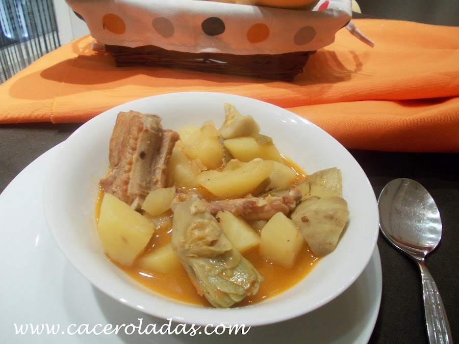 Riquísimas patatas guisadas con costillas y alcachofas, que os encantará.