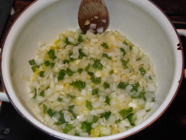 Lo primero que hacemos es cortar en trozos pequeños las verduras. Ponemos una cacerola con un buen fondo de aceite y echamos primero los ajos picaditos con el pimiento verde para que se vaya cocinando. Cuando hayan pasado cinco minutos añadimos la cebolla, salamos y dejamos rehogar las verduras hasta que están transparentes.