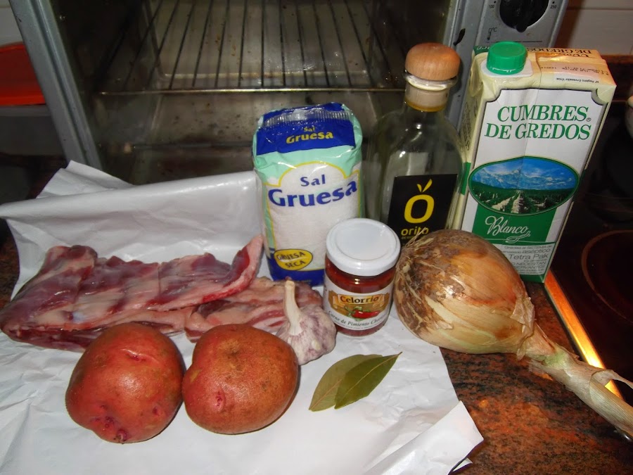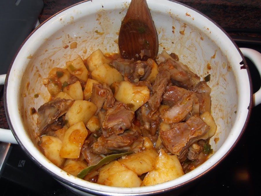 Ahora sólo queda cubrir las patatas y la carne con el agua y salar el caldo. Lo dejamos cociendo a fuego medio durante 45 minutos o hasta que veamos que la patata está blanda. Si el caldo nos ha quedado demasiado aguado podemos sacar varios trozos de patata con un poco de caldo a un plato y machacarlo para darle espesor. Cuando la patata esté blanda ya está listo para comer.