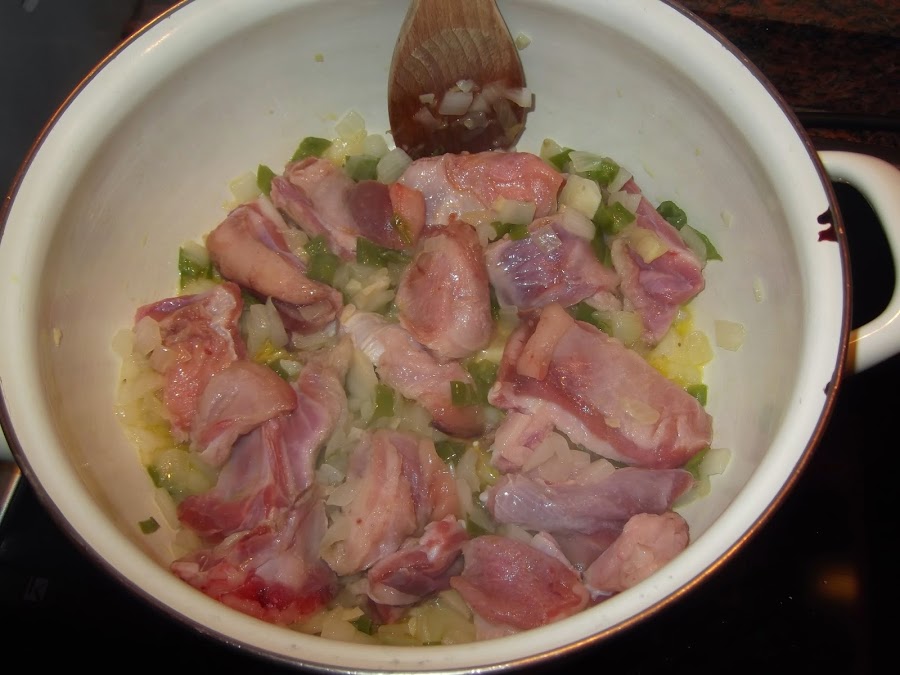 Una vez que tenemos las verduras rehogas añadimos las costillas saladas que tendrán que estar partidas y las tenemos ahí hasta que cambien de color. Mientras tanto vamos pelando y chascando las patatas, esto lo hacemos para ayudar a que se espesa un poco el caldo. Una vez que las costillas han cambiado de color salamos las patatas y se las añadimos al guiso. Le damos varias vueltas y le añadimos un chorro generoso de vino blanco, subimos el fuego para que se evapore el alcohol y añadimos la carne del pimiento choricero. Le damos varias vueltas para que se esparza por todo el guiso.