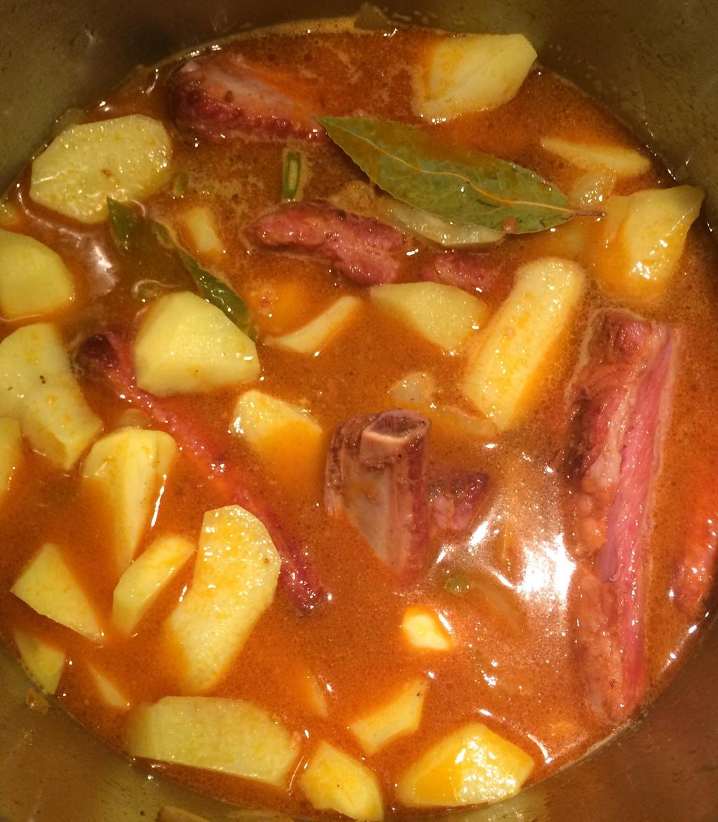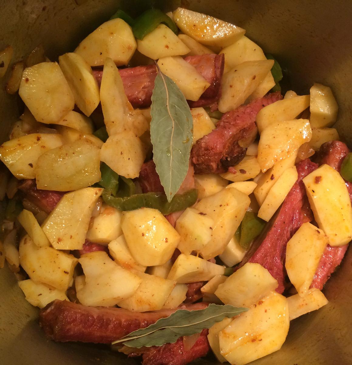 Echar el vino , el laurel , sal , pimienta y las patatas chascadas y dejar que hierva un poco