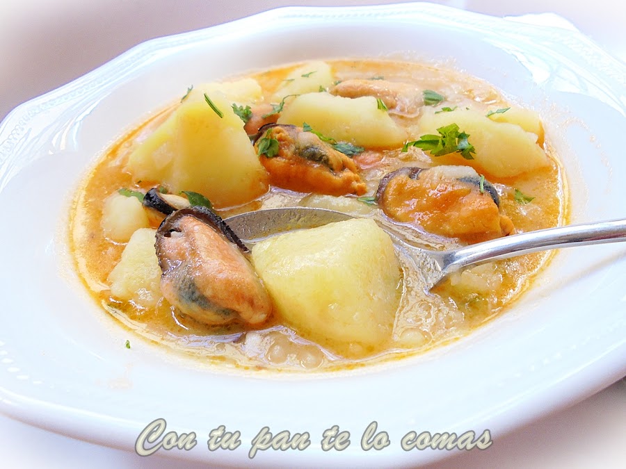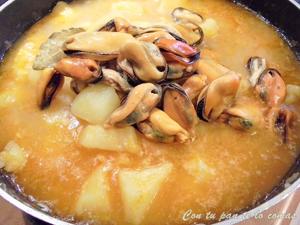 7. Cuando veas que las patatas están tiernas, añadimos los mejillones sin las valvas y el caldito que habremos pasado por un colador para evitar cualquier resto de tierra que hayan soltado los mejillones. Dejamos que hierva todo junto, a fuego muy suave, durante dos o tres minutos más.