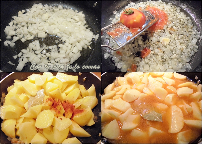 5. Pelamos y triscamos las patatas, esto es trocearlas con un cuchillo pero al llegar al final arrancar lo que queda para que suelten el almidón y la salsa quede más gordita. Intenta hacer los trozos del mismo tamaño para que se hagan todas por igual. Añadimos el pimentón dulce, la hoja de laurel y sazonamos con sal.