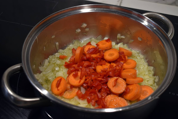 Lavamos el pimiento y la zanahoria, el pimiento lo hacemos a trozos pequeños y la zanahoria la hacemos a rodajas, lo añadimos junto a la cebolla.