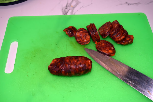 Cortamos los chorizos a rodajas y lo echamos a la olla removemos y saltemos unos minutos.