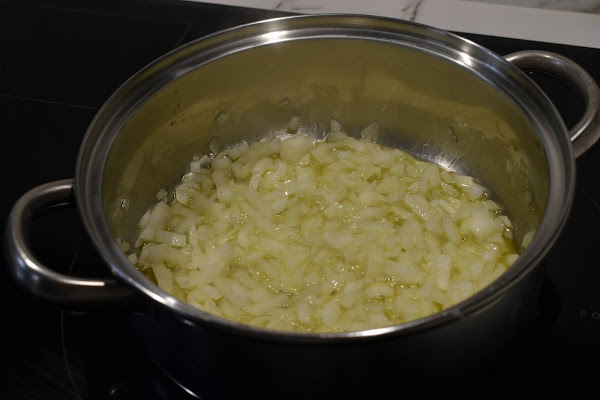 Pelamos la cebolla y la cortamos en trozos pequeños y la echamos a sofreír.