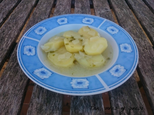 En el mismo aceite pochamos la cebolla, cuando comience a dorarse añadimos las patatas y las rehogamos. Añadimos la harina y la rehogamos también. Cubrimos las patatas con agua. Salamos a nuestro gusto. En el morteromajamos los dientes de ajosofritos con el perejily desleímos todo con un poco de agua. Añadimos este majado a la cazuela y cocinamos a fuego lento hasta que las patatas estén tiernas.
