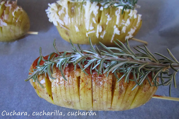 - o bien, pincha un palillo largo en la base de la patata y corta las rebanadas sin extraer el palillo hasta que estén cocinadas y frías.