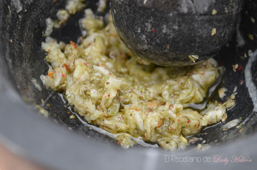 Coloca las láminas que te sobren en un mortero (en nuestro caso fueron unos dos ajos) junto con la sal, el romero, el tomillo, la cayena, la pimienta y el aceite. Mezcla todo hasta conseguir un majado uniforme.