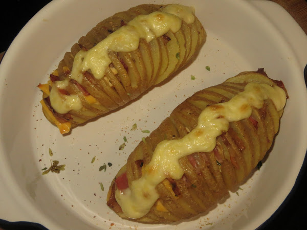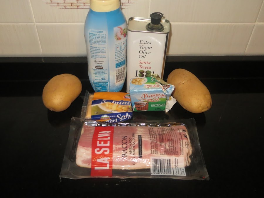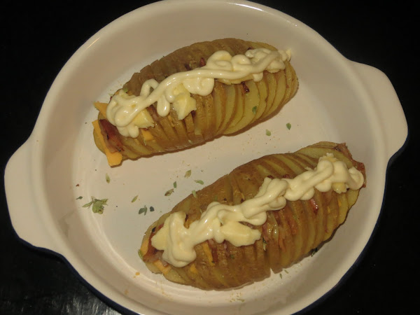 Una vez pasado el tiempo, las sacamos, dejamos que se enfríen, retiramos el papel film, las colocamos en un recipiente apto para microondas y las vamos rellenando con los ingredientes que más nos gusten, el bacon lo he pasado un poco por la plancha. Entre cada lámina colocamos un trozo de bacon, otro de queso y luego salmos un poco y les echamos el ajo en polvo, la cebolla en polvo y el orégano. Ponemos encima un poco de mantequilla y la mayonesa.